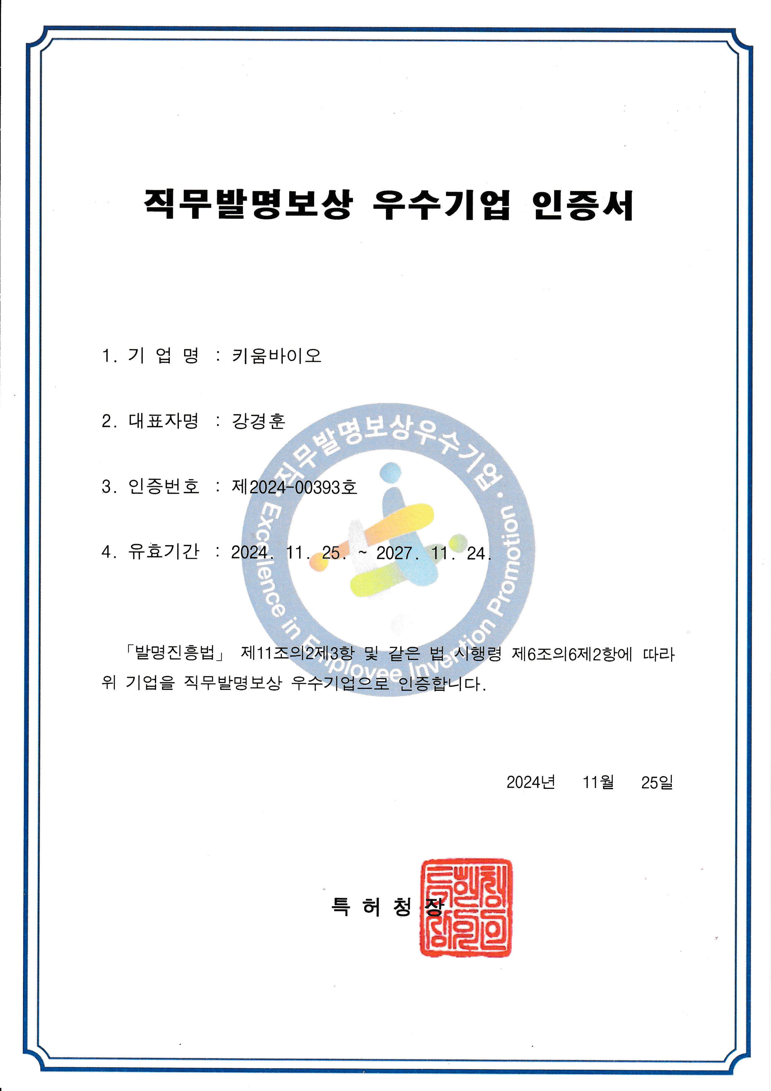 홍보자료 직무발명보상 우수기업 인증 작성자 kiumbio 작성일 2025-01-07 10:37 조회 418 좋아요 0 싫어요 0 인쇄 « 가족친화기업 인증 획득 2025 성장사다리기업 리더스 혁신 포럼 참가[신규 돋움기업 지정서 수여] » 목록보기